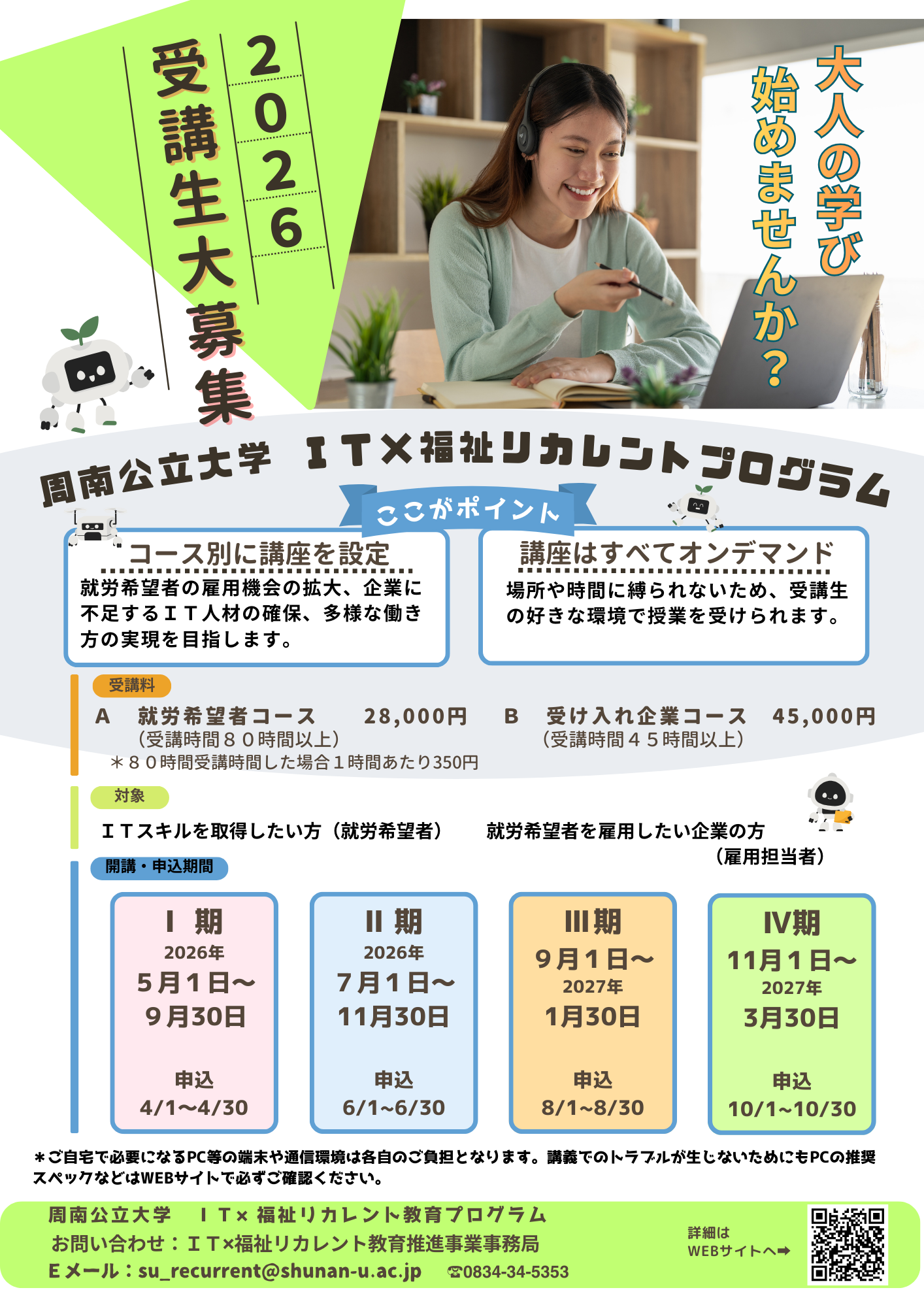 | お問い合わせ | 周南公立大学 IT×福祉リカレント教育推進事業事務局 E-mail:su_recurrent@shunan-u.ac.jp(平日 9:00〜17:00) |