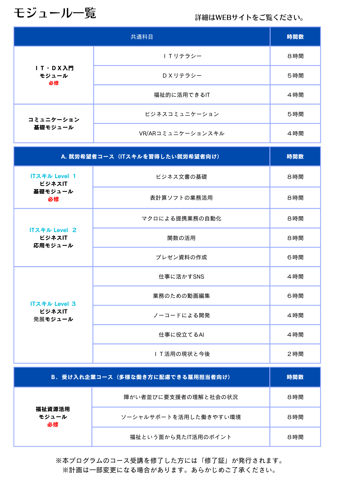 | 受講料 | Aコース 就労希望者コース 28,000円 Bコース 受け入れ企業コース 45,000円 ※1 1科目からの部分受講も可能です。就労希望者の方は1回350円×科目の所定の時間数、企業担当者の方は1回1,000円×科目の所定の時間数の受講料をお支払いいただきます。 ※2 ただし、ご自宅で必要になるPC等の端末や通信環境は各自のご負担となります。 |